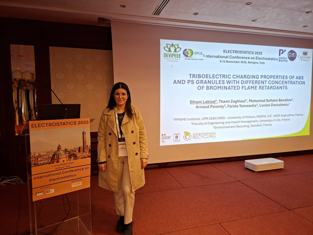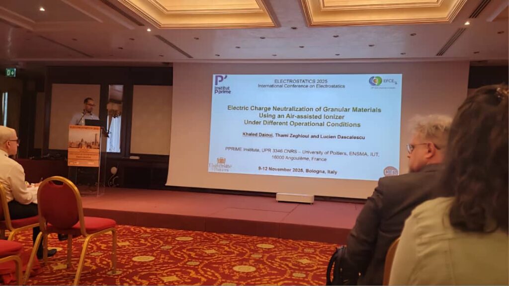 Nous sommes heureux d’annoncer la participation de Khaled DAIOUI, postdoctorant, ainsi que de Siham LABIOD, doctorante, au sein du Laboratoire Pprime à la conférence internationale Electrostatics 2025, qui s’est tenue à Bologne, en Italie, et qui était organisée par l’AIDIC (Association italienne d’ingénierie chimique) en collaboration avec l’EFCE (Fédération européenne du génie chimique). Leur participation s’inscrit dans le cadre du projet collaboratif DEVIPEEE.